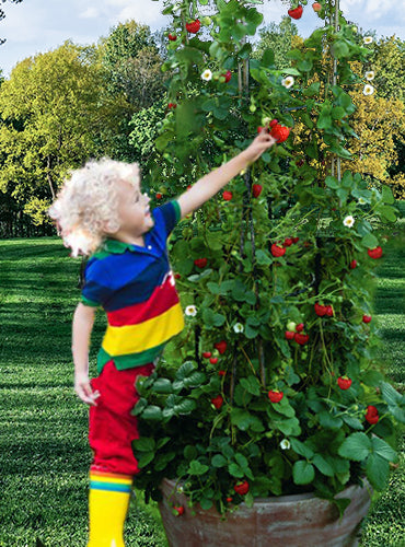 Představte si radost svých dětí, když jim dovolíte, aby si z vašeho "jahodového popínavého stromu" utrhly tyto velké, sladké, zralé, čisté plody bez půdy.